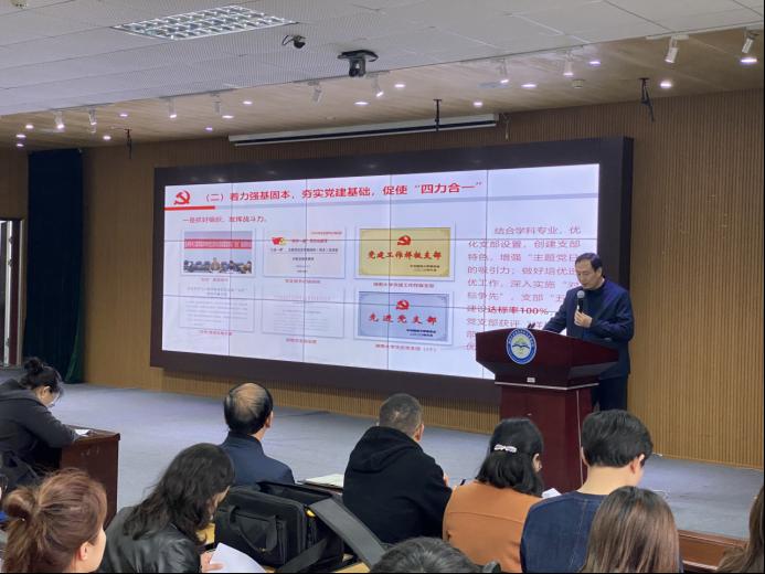 杨书记还对学院2021年党建工作要点进行了解读,指出了学院党建工作质量提升的11个要点。他强调,2021年度工作必须坚持以习近平新时代中国特色社会主义思想为指导,深入学习贯彻党的十九大和十九届二中、三中、四中、五中全会精神,全面推进党的政治建设、思想建设、组织建设、作风建设、纪律建设、制度建设,为学院各项事业发展提供坚强的政治保障。
