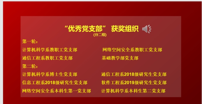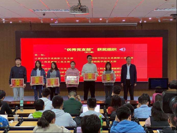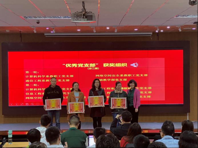 党委关于表彰2020年度学院样板党支部、优秀党支部、优秀党务工作者的决定》。计算机科学系博士生党支部等3个师生支部被授予“样板党支部”称号,计算机科学系教职工党支部、通信工程系2018级研究生党支部等10个师生党支部被授予 “优秀党支部”称号,张国田等16位同志被授予“优秀党务工作者”称号。在热烈的掌声中,与会领导为获奖组织和个人颁奖。