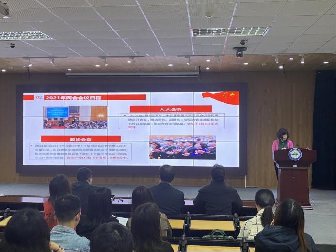 大会的总结表彰阶段在国际歌歌声中落下帷幕,紧接着进入“两会”精神宣讲阶段。学院党委副书记、纪委书记骆嘉伟从2021年“两会”的基本情况、2021年“两会”七大看点、九个关键词、2021年政府工作报告、2021年全国政协工作报告四个方面进行了专题解读。