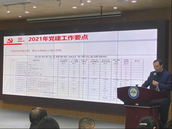 2021年是中国共产党成立100周年,也是实施“十四五”规划、开启全面建设社会主义现代化国家新征程的第一年。全院上下要切实做好各项重点工作,整体推进学校学科水平提升。以建党100周年为契机,全面推进党的建设,以新面貌、新担当,汇聚正能量、提振精气神,齐心协力高质量推进落实全年各项工作任务,以优异成绩向建党100周年献礼。