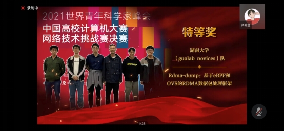 2020级研究生尹希金、詹晓宁、张鑫和2017级本科生施秉辰、骆一鑫组成的参赛队伍guolab novices,在陈果老师的指导下,完成作品“RDMA-dump:基于eBPF和OVS的RDMA数据包处理框架”,夺得挑战赛创新创意赛项特等奖。
