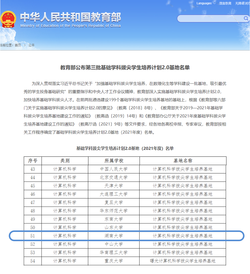 计算机科学拔尖学生培养基地入选。