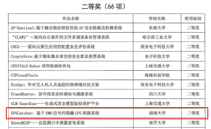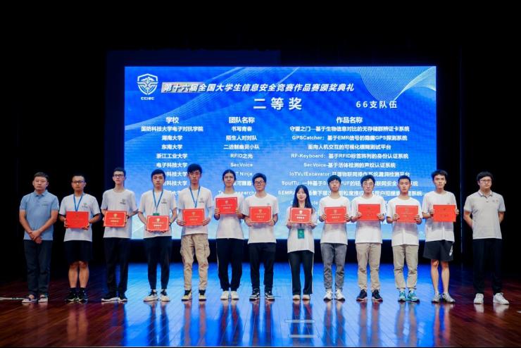 2023年8月17-20日,由教育部高等学校网络空间安全专业教学指导委员会主办,浙江大学、杭州电子科技大学承办,区块链与数据安全全国重点实验室等单位协办的第十六届全国大学生信息安全竞赛作品赛决赛在浙江大学紫金港校区圆满结束。在廖鑫老师的悉心指导下,学生薛宇航、陈键博、李校、王正荧四位同学成功完成了题为“见微知著——基于深度学习的抗局部屏摄水印系统”的作品。在靳文强老师的引领下,学生乐弘、李雪、王昱杰、郭光沛四位同学精心研发了名为“GPSCatcher:基于EMR信号的隐藏GPS探测系统”的项目。这两个作品在经过初赛评审、决赛测试、决赛答辩和决赛会评的多重环节竞争后,双双荣获了全国总决赛的二等奖。