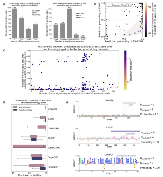 结合蛋白质领域自适应蛋白质语言模型ESM-DBP,主要通过在通用蛋白质语言模型的基础上使用海量的DNA结合蛋白质序列进行掩码预训练,并在DNA结合蛋白质相关的四个下游任务上系统地评估了ESM-DBP的预测性能。在多个基准测试集上和现有预测方法的比较展示了ESM-DBP优异的预测精度。ESM-DBP还展现了在只有少量相似的同源序列的蛋白质序列上较好的预测性能,远远超过通用蛋白质语言模型和国内外其他预测方法,为解决在机器学习在低同源蛋白上的功能预测精度低这一痛点提供了新的视角。
