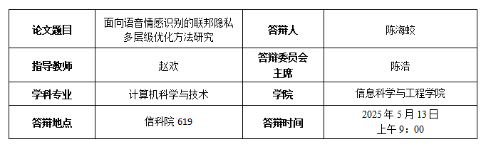 [4] Huan Zhao, Haijiao Chen*, Yufeng Xiao, and Zixing Zhang, “Privacy-enhanced federated learning against attribute inference attack for speech emotion recognition,” in Proc. IEEE International Conference on Acoustics, Speech and Signal Processing, 2023, pp. 1-5. (EI,CCF-B类,导师一作)