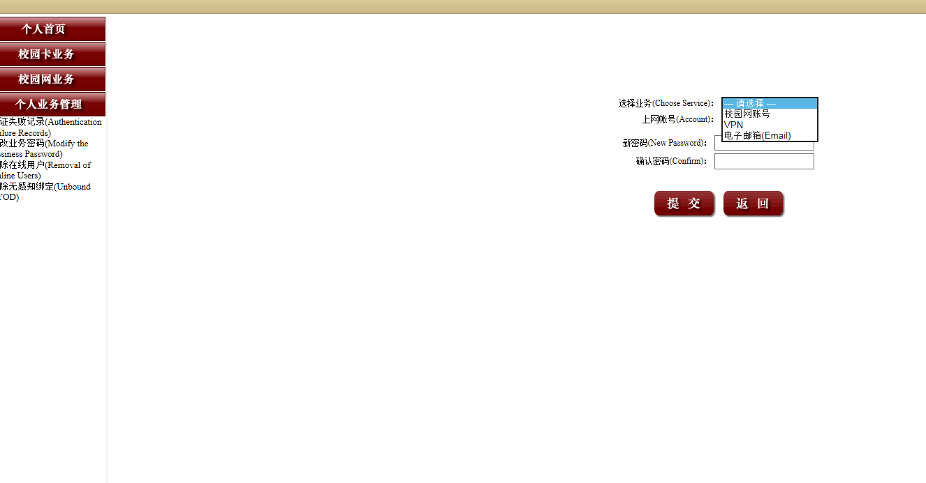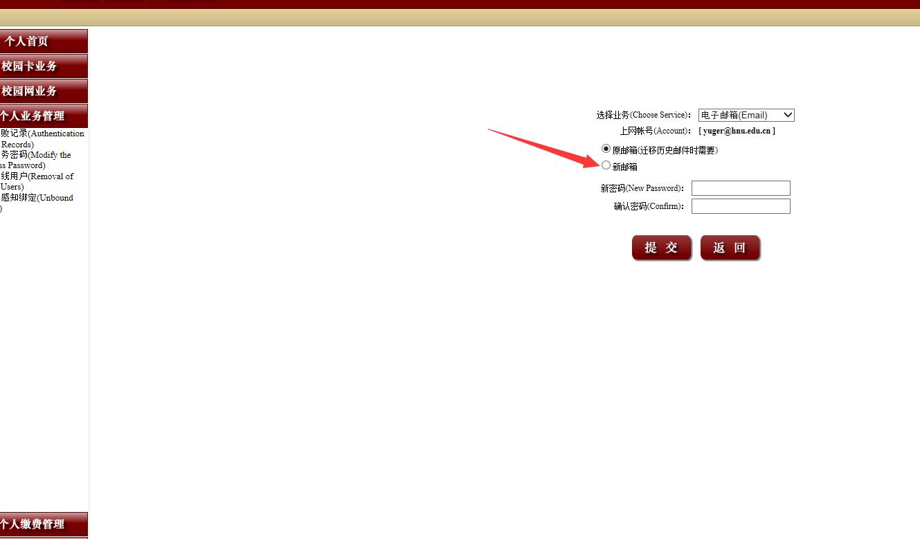 针对学校邮箱从原系统迁移至新系统,邮箱密码的更改和重置,个人用户可以从个人门户登录后,进入校园网业务进行更改。